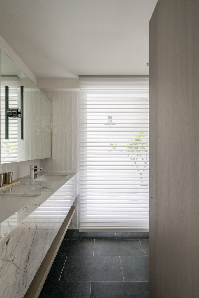 早期的老房子傳統規劃,大多是中間設置狹長走道,連接其他各個空間,但這也導致光線難以引入室內,因此老屋翻新「光線」往往都是一大挑戰。「光線最薄弱的中段,設立廊道和通往地下室的樓梯,視線和光線就能自然延伸並貫穿全室。」吳宜哲將設計重點,著重於如何讓採光自然,同時又要打破封閉感,使空間更開放明亮。因此選擇打開原有的天井屋頂,將戶外空間巧妙打造成小花園;客用浴室也新增落地玻璃窗,完整運用天井的自然光線;而在廊道的設計上,則透過格柵門,使陽光以不同的樣貌進入室內。