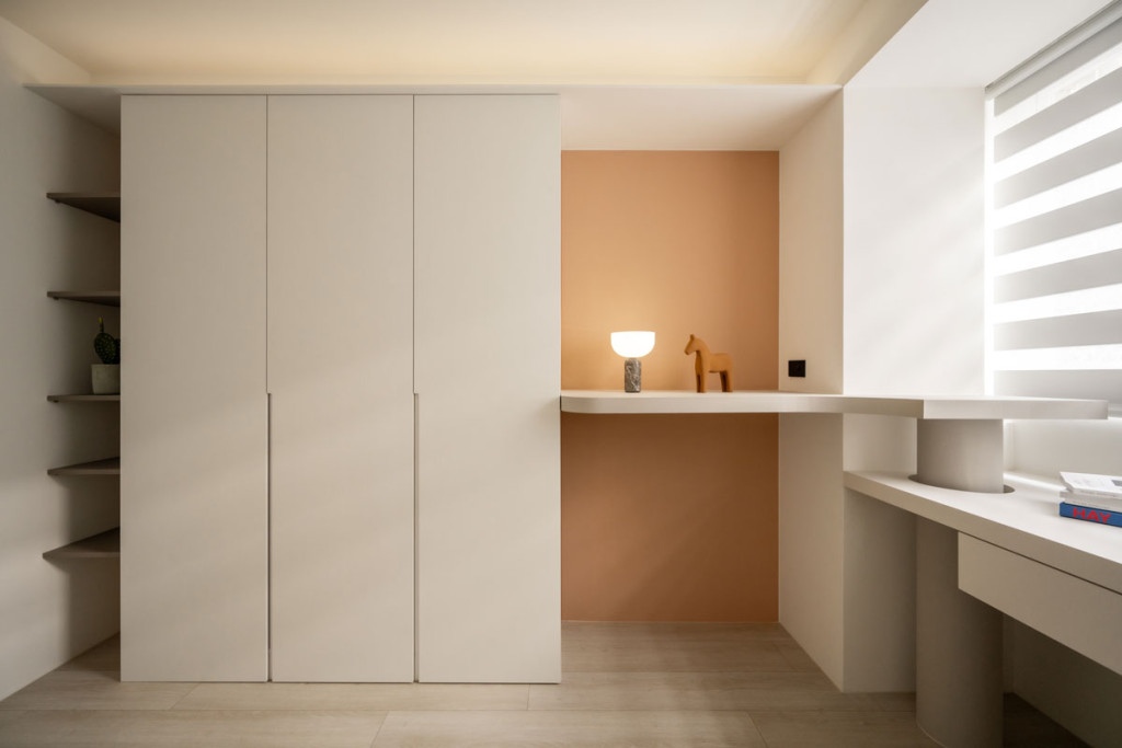 「朝昭暮沐」位於台北市大安區寧靜的巷弄內,是一間乘載著40年歲月的舊公寓,裡頭住著一對夫妻和一個可愛的女兒,因為和小孩的年齡差距較大,業主希望室內的裝潢不要太過保守,可以利用不同元素增添現代感。吳宜哲和業主討論過後,決定採用淺木紋色調,營造帶有禪意的簡約風格。