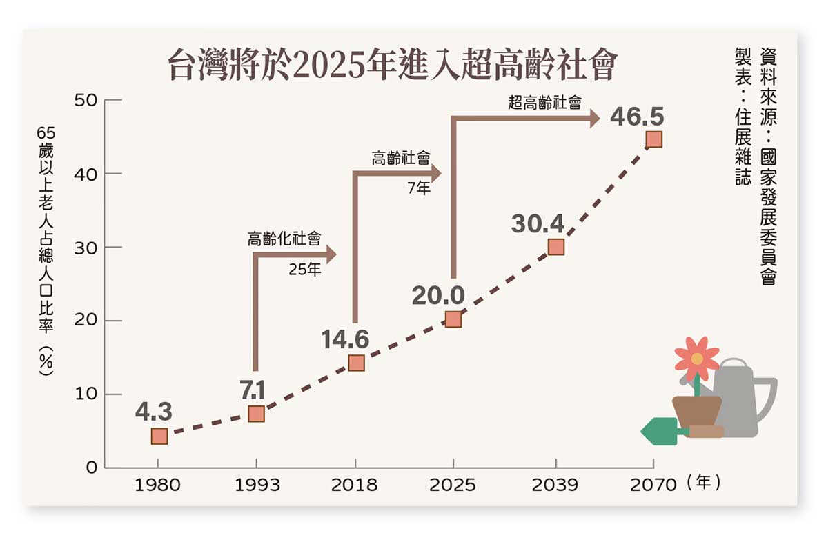 2018年台灣從1993年的高齡化社會,進入到高齡社會,花了25年,邁入超高齡社會卻只花了7年,人口高齡老化速度堪稱世界第一,甚至超越社會意識的自然演進腳步;在變老這條路上,政府如何立法吸引民間響應,恐怕已刻不容緩,否則在不久到來的「新老社會」裡,廣大銀髮族將難以安居。