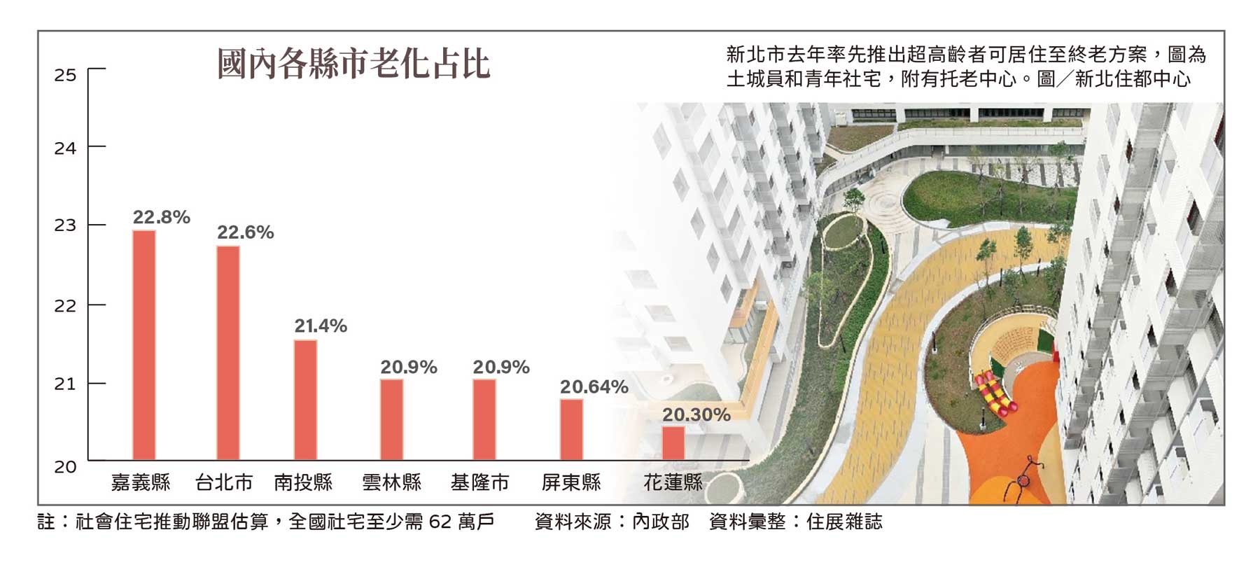 根據內政部最新統計,全台各縣市的老化程度,嘉義縣以超高齡人口占比22.8%居冠,其次是台北市22.6%,第三是南投縣21.4%,雲林縣和基隆市則並列第四,其餘如屏東縣、花蓮縣也超過20%門檻,相當於全台近三分之一的縣市都提前進入超高齡社會。