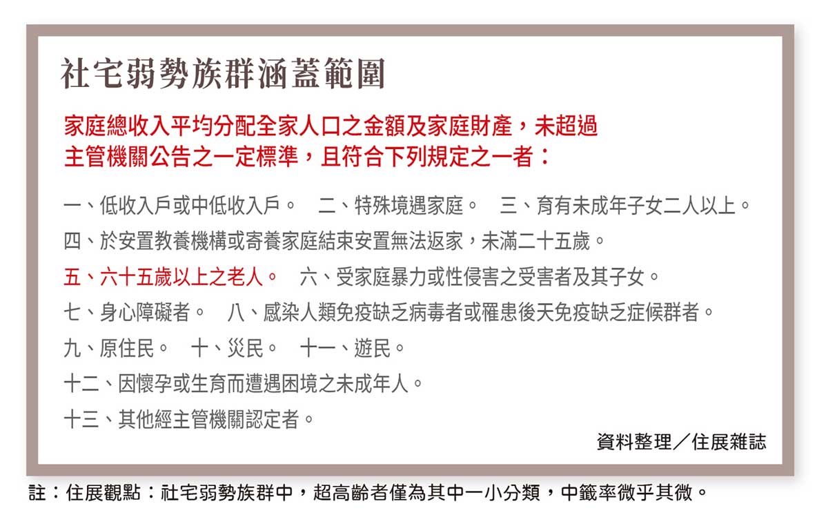 對此,社會住宅推動聯盟指出,若以現行法規制定的四成弱勢保障名額估算,全國社宅至少需要62萬戶才能真正保障銀髮弱勢的居住權,目前看來還有很長一段路要走。