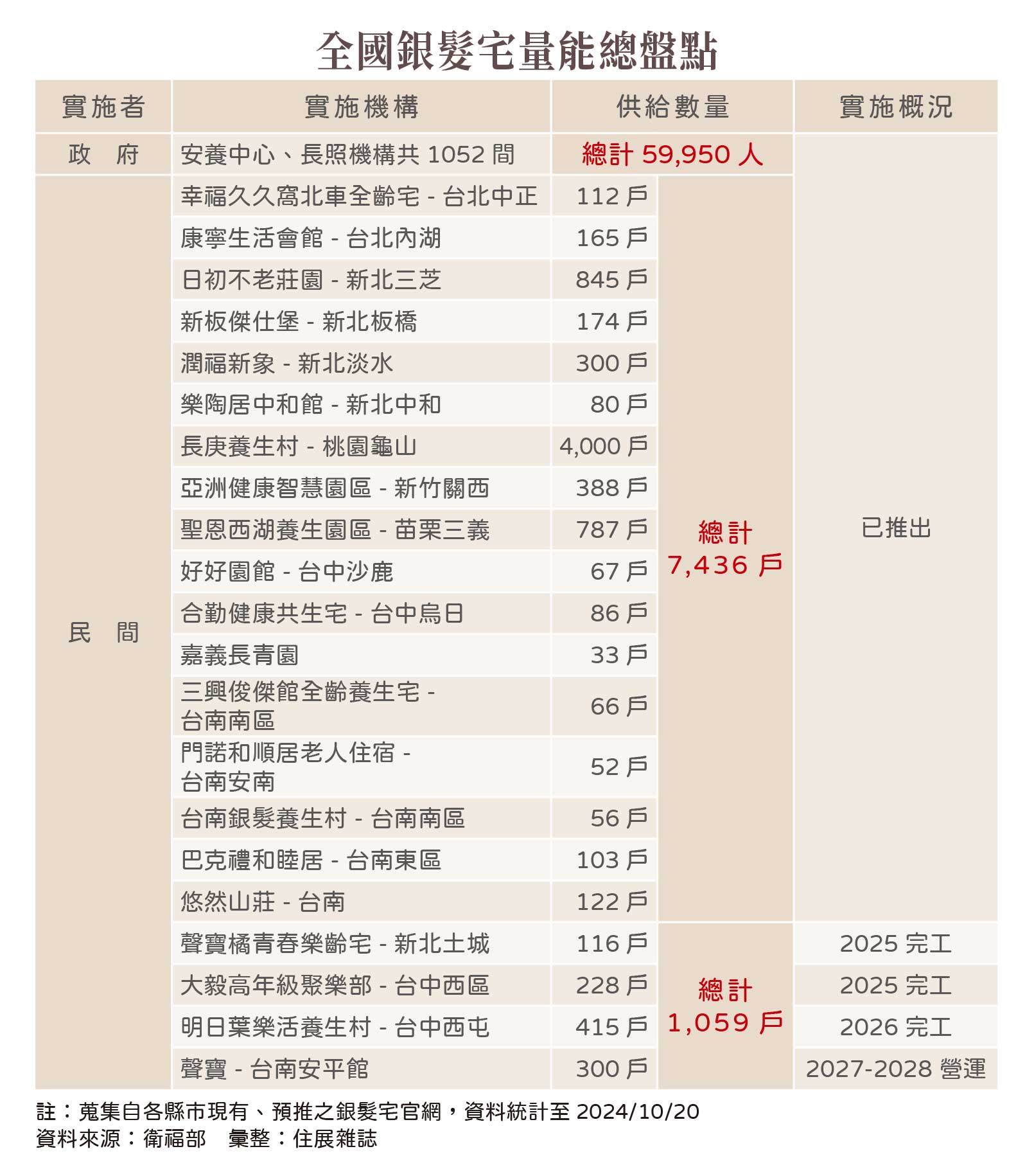 《住展雜誌》盤點全台已招租、興建中的銀髮宅總數量,得出僅8495戶的服務量能,然而,根據仲量聯行從行政院主計處及衛福部相關統計數據交叉分析,在健康與經濟條件符合的中高齡人口當中,有較高意願入住銀髮住宅的潛在需求者,保守推估約4.3萬人,兩相對照,銀髮宅明顯供不應求。