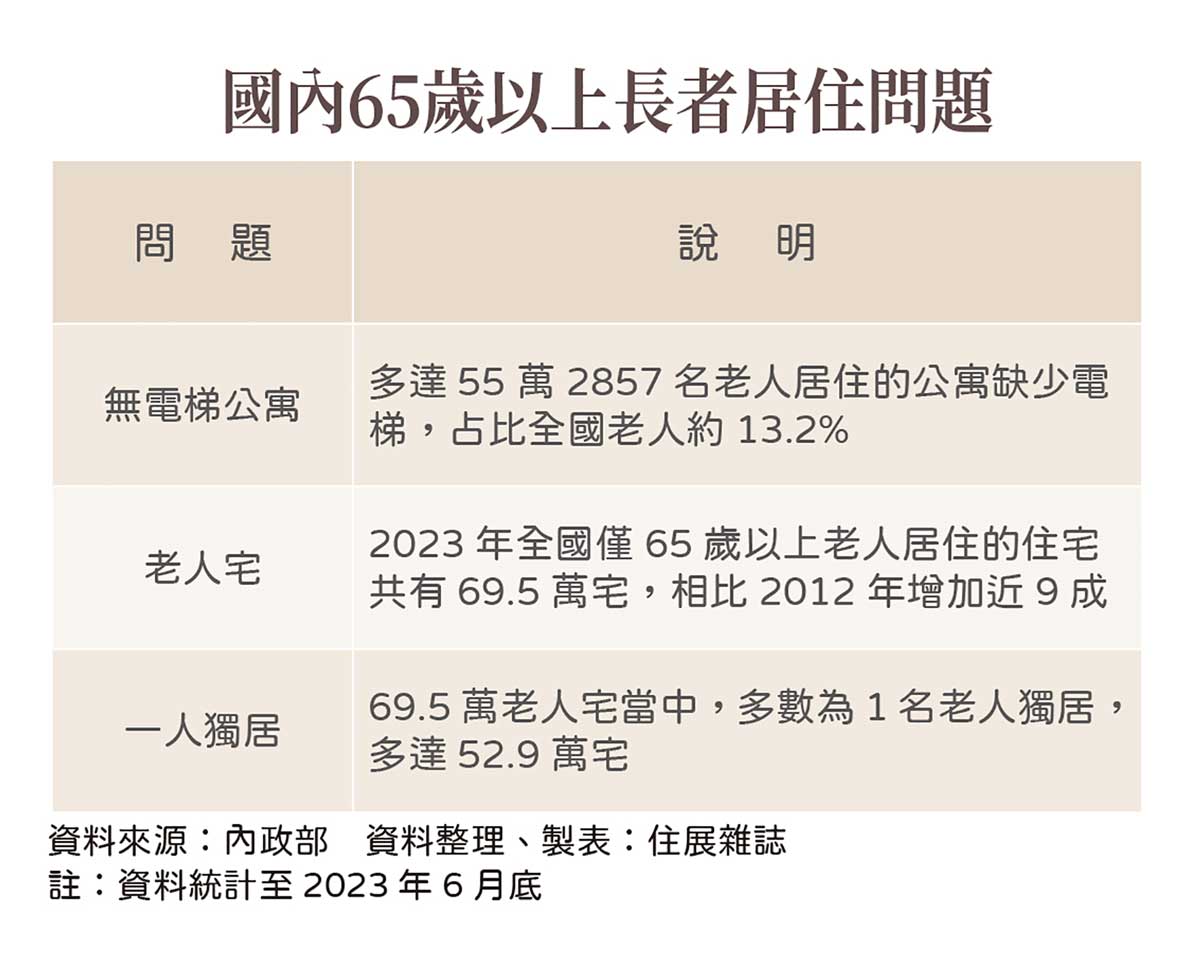 相較於銀髮宅的高規格電梯,不少居住在老屋的高齡長者只求「有就好」。根據內政部統計資料,全台屋齡30年以上的老屋有483萬戶,比例高達52.3%,其中,台北市71.9%的老屋中,甚至一半都是五層樓以下沒有電梯的老舊住宅;截至2023年6月底,國內65歲以上人口中,共有552,857人都居住於無電梯公寓。
