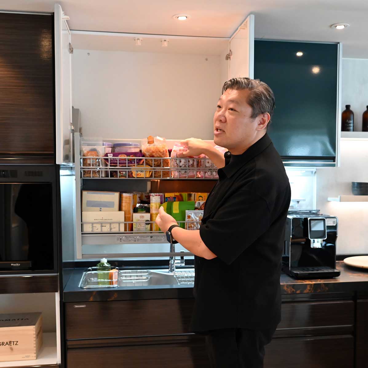 考量不同使用者的身高不同,或是老人不易於彎腰取物,廚房收納櫃的設計要以「不需要大幅度移動身體即可操作」為原則,可將爐具上方的吊櫃做成可下拉式;靠近地面的部分,可減少流理台的水槽深度,並將排水管線、濾水器等往內靠向牆壁,以便在廚下空間加入深度較淺的上層抽屜,讓小孩與老人不需要蹲低或爬高,就可以使用廚房約三分之二的空間。