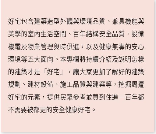 人在建築物裡活動得安心、安全,身體和心理獲得安穩、安定,才能進而顯現建物的正面價值和提升生活品質。