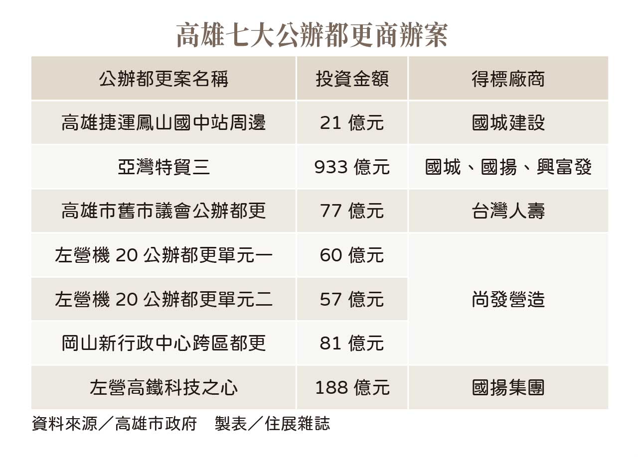 至於在高雄地區,「A辦數量嚴重不足,歡迎投資人來高雄。」市長陳其邁曾經的一席話,起因是近年半導體S廊帶成型,加上台積電設廠的推波助瀾,商辦需求量大增,因此政府陸續推動公辦都更,目前高雄有七大公辦都更正在進行中,包含亞灣特貿三、舊市議會都更、左營機20公辦都更單元一等,引進民間的投資總額已衝高至1417億元。國揚集團更是與高雄市府聯手,斥資188億元打造左營高鐵科技之心,將興建三棟複合式的商辦大樓,可望帶動周邊發展。