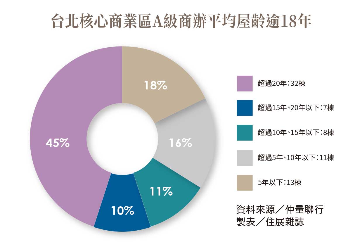 一直以來,雙北地區都是金融、商業等核心重鎮,勢必持續會有商辦需求,不過隨著時間洗禮,過去興建的商辦已過於老舊,加上素地越來越稀缺,因此新商辦的供給,大多來自於老舊商辦的都更翻新,根據仲量聯行統計,台北市A級商辦平均屋齡超過18年,其中有32棟A辦屋齡已20年以上,換句話說,目前約有45%的老商辦等著都更,擴大新供給。