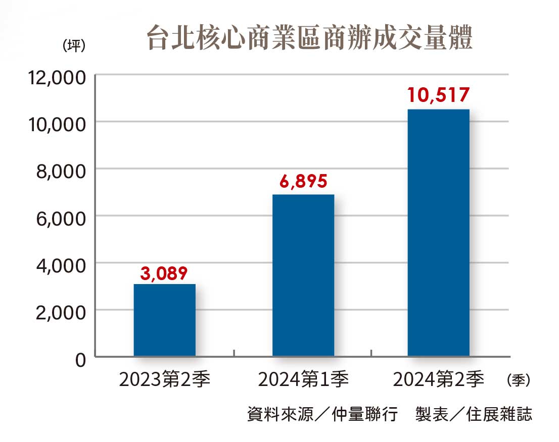 攤開仲量聯行統計數據,便可發現今年商辦市場的需求量確實大幅提升,第二季核心商業區成交量體為10,517坪,較去年同期成長約240%;進一步綜觀上半年商辦的成交量體,更是接近去年全年整體的成交總和;其中,A級商辦需求強勁,租賃成交量達到6825坪,合計今年前三季度累計成交量已達24,237坪,超越去年全年數據,其中台北市釋出0至1年屋齡的新供給,佔整體成交面積45%,預租成交佔比則為27%。