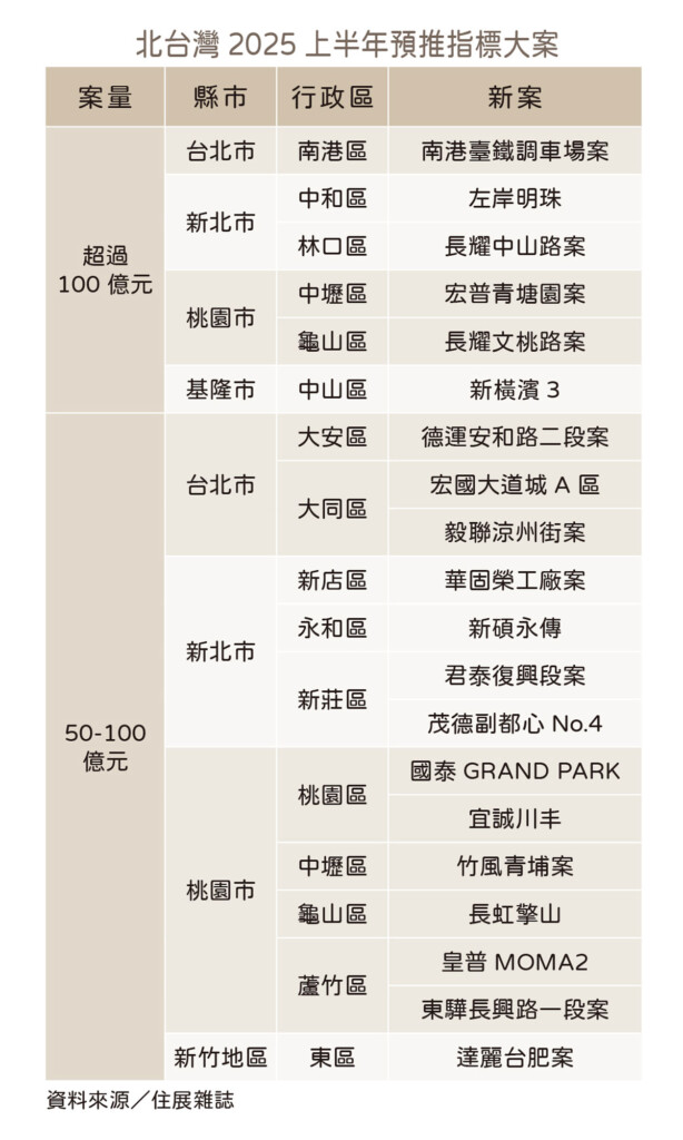 住展雜誌彙整北台灣相較明確在2025年上半年有意登場指標案,推估超過100億元案量計有6案,50至200億元共14案,不難看出正在於地段優勢、建商品牌、市場話題而讓建商保持一定信心,迎戰不明確局勢。