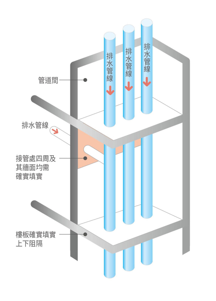 當管道間若砌磚不確實,空氣累積在天花板內,而沒有銜接對外風管,將無實質換氣的功能,浴廁還是會潮濕發霉,建議排出的氣自行獨立出一個排氣管道而不進共通管道,可以避免在自家聞到其他住戶排放出的廢氣或是減少藉由空氣傳播的傳染性疾病進入家戶的機會,譬如設計「當層排氣」的系統。