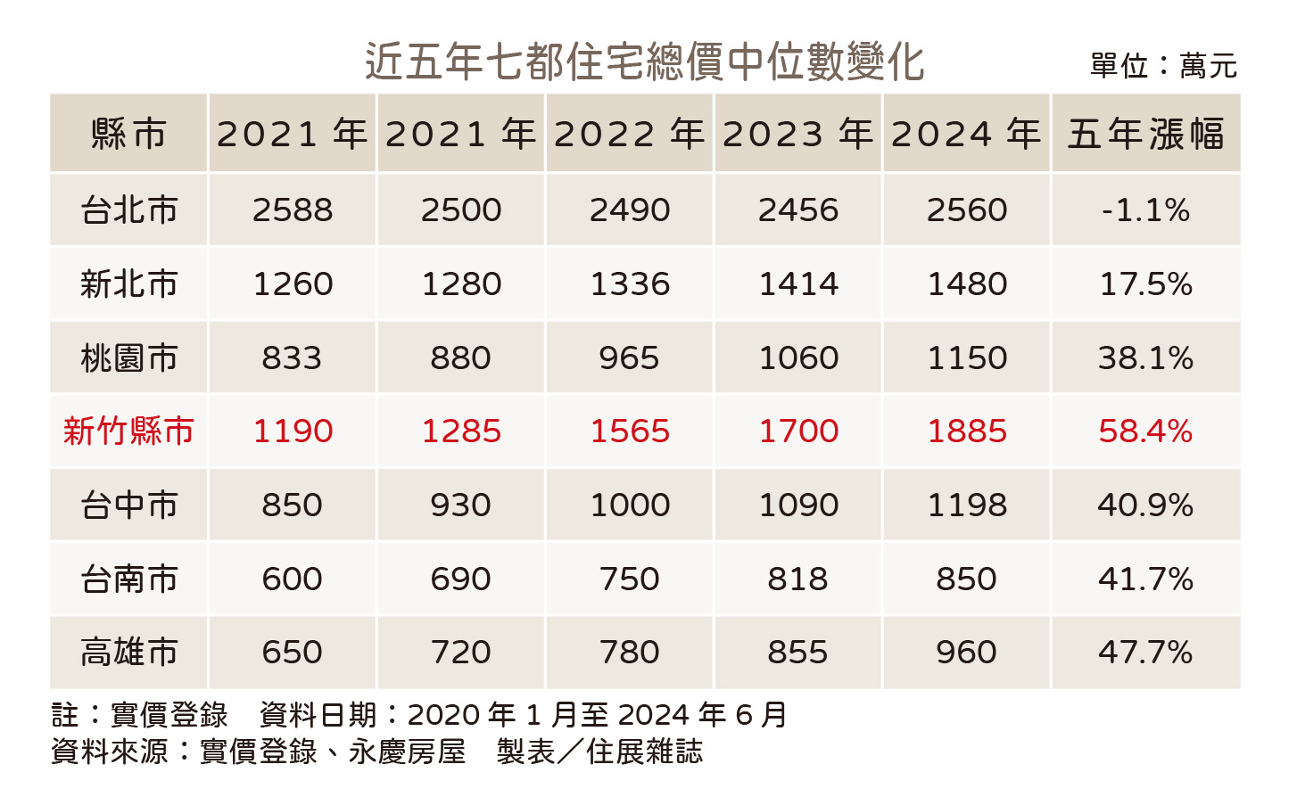 推案量縮、銀行水位也不被看好,在房價方面更是將迎來震盪盤整。攤開永慶房屋的統計數據,觀察近五年七大都會區的住宅總價變化,除了台北市是負成長之外,其他都會區皆是雙位數的成長率,其中新竹縣市漲幅最兇,達58.4%,第二名則是高雄市,五年的漲幅也有47.7%。