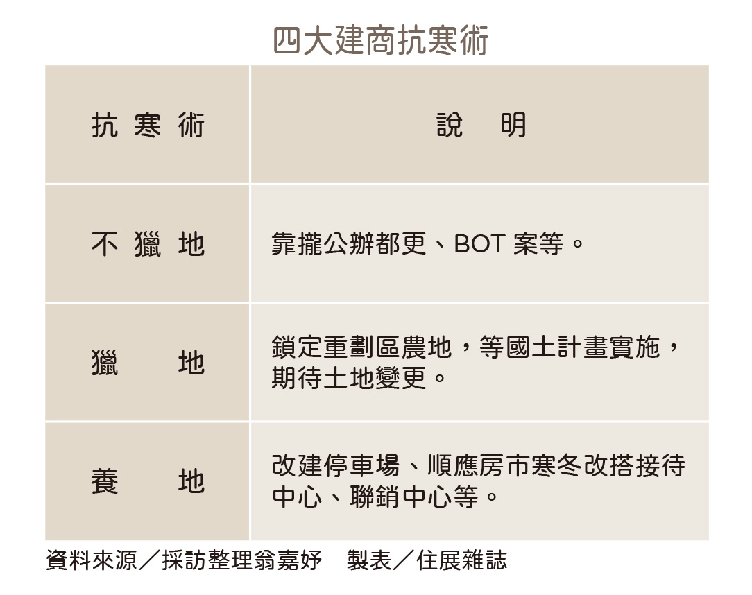 究竟寒冬中建商又要如何自保存活?本刊彙整出「四大抗寒術」,無論是中小型或大型建商,採取的策略基本上多以「不買地」為原則,轉向跟政府合作都更案,或是捷運共構BOT案、地上權等等。