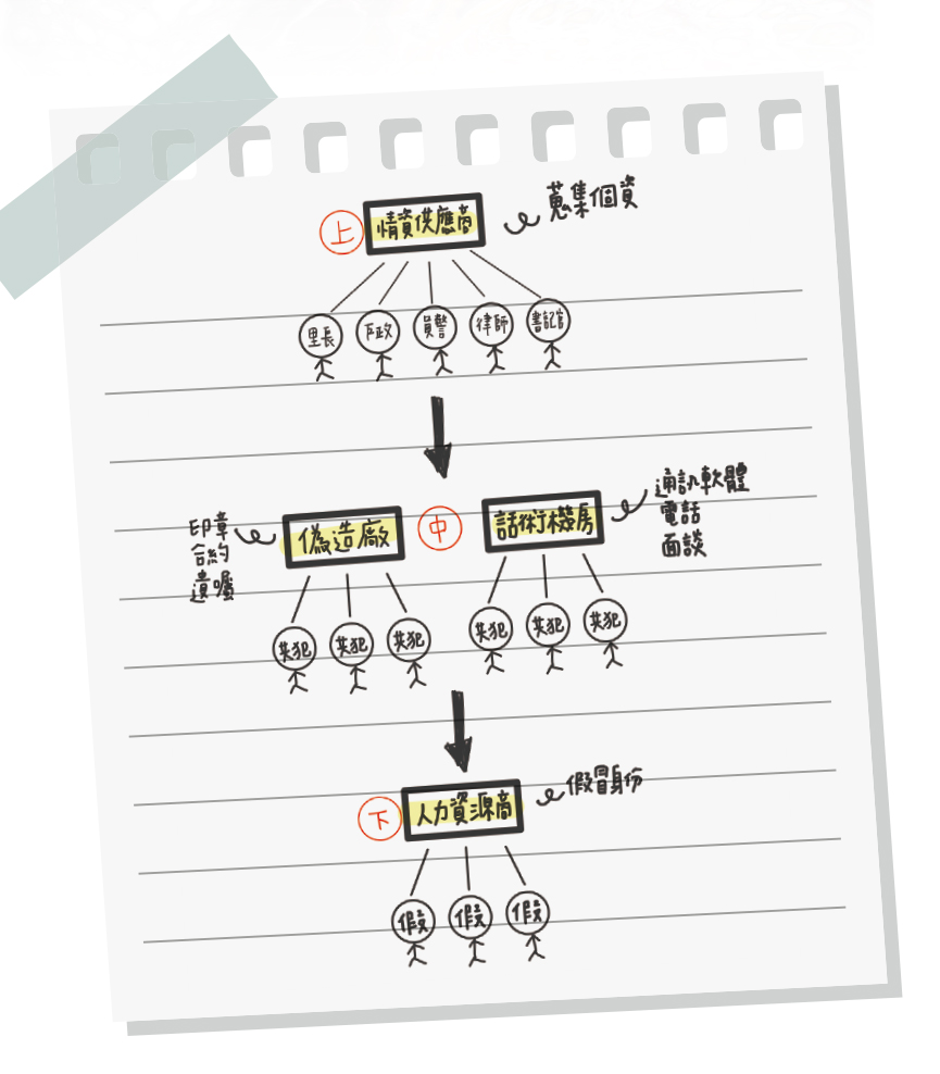 除了最源頭的謀劃者,詐騙集團裡還有負責偽造文書的「偽造廠」、提供話術的「機房」,甚至會挖角專業人士充當「人力資源商」,更不乏監守自盜的「內鬼」公務員,整條供應鏈宛如社會黑暗面的一條流水線,日夜開工,不斷攫取巨額財富。