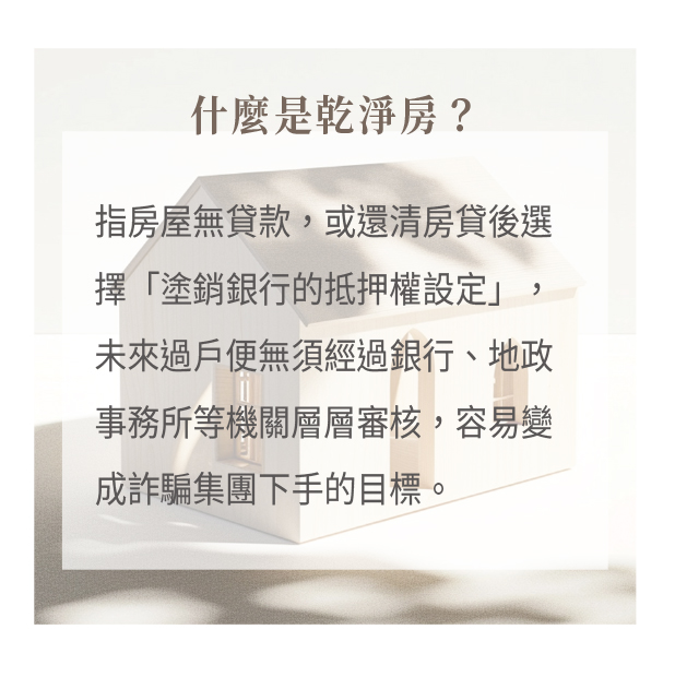 「什麼是乾淨房?簡單來說,就是已經完全塗銷抵押權的房屋。」鄭文在解釋,當房屋仍有貸款時,若要進行產權轉移,買方除了支付房款,還必須承接剩餘貸款,並經過銀行審核,因此過戶程序會受到層層把關,詐騙集團較難下手。然而,若房貸已繳清且屋主塗銷了抵押權,房屋轉讓的門檻就大幅降低,讓詐騙集團更容易得手。