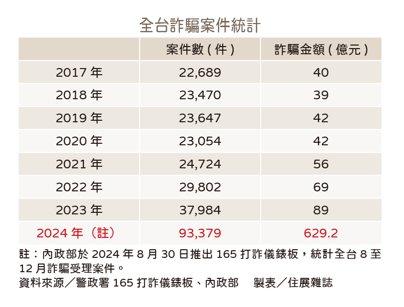 攤開警政署公布的統計資料,2017年受理的詐騙案件為22,689件,財損約40億元,而到了2023年,案件數激增至3萬多件,財損更翻倍達到89億元。然而,2024年下旬,短短5個月內,全台受理的詐騙案件暴增至93,379件,詐騙金額更飆破629億元。