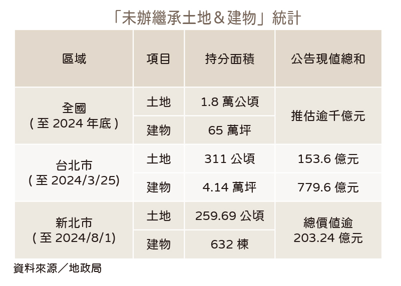 「台灣已步入超高齡社會,未來未繼承的房產只會越來越多。」台北市政府地政局副局長王瑞雲指出,全國未辦理繼承的土地已高達1.8萬公頃,未辦理繼承的建物面積達65萬坪,相當於5.2棟台北101大樓的總樓地板面積。