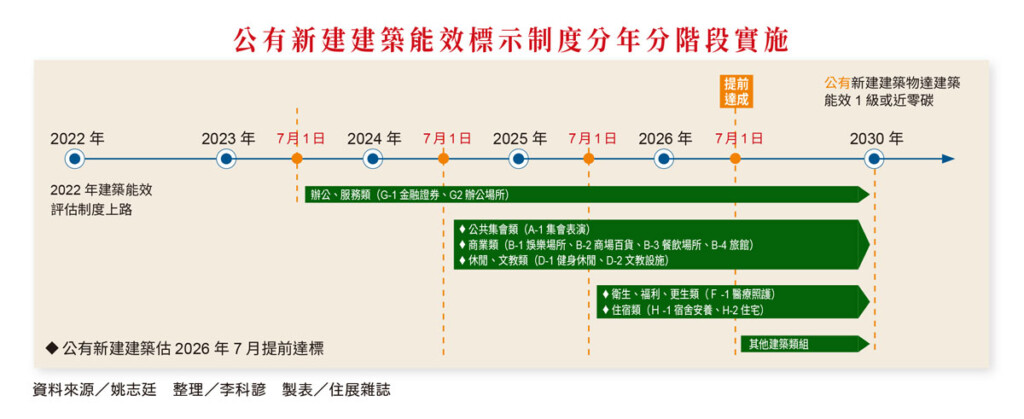 公有新建建築能效標示制度已於2023年7月上路,預計2030年達標,使新建建築能效達一級或近零碳排。而目前計畫進度超前,預計2026年7月即可達標。