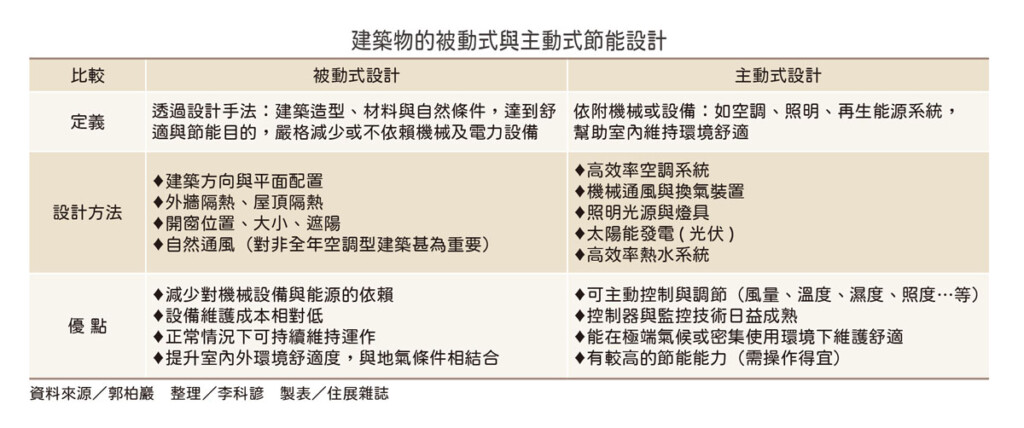 其中,節能改善具備極大發展空間,可透過「主動式設計」 和「被動式設計」兩大面向著手。2023年6月通過的《再生能源發展條例》明確要求,未來新建建築需具備自發電能力。
