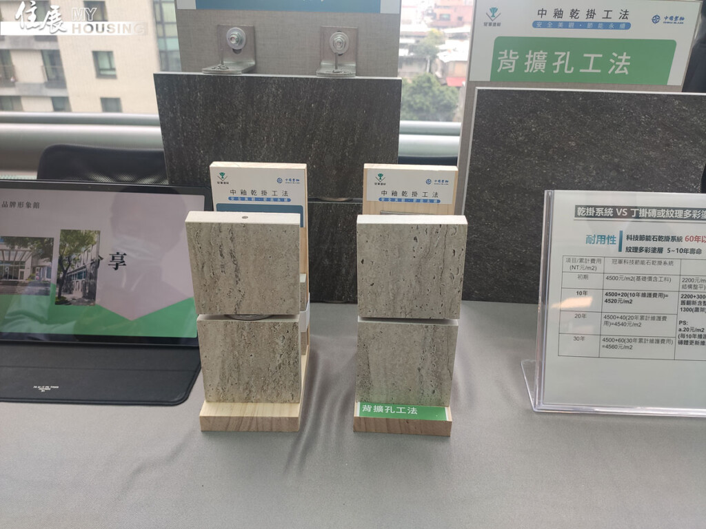 而冠軍建材的「外牆乾掛節能工法」,藉由通氣層讓熱對流排氣、排濕也能阻擋熱輻射,能讓室內降溫約4度左右,冷氣用電減少24%至36%;辦公建築總耗能降低12%至18%,住宅建築總耗能降低4.8%至7.2%。亞昕建設30周年的指標大案『亞昕森匯』與『亞昕天匯』便有採用這項技術。
