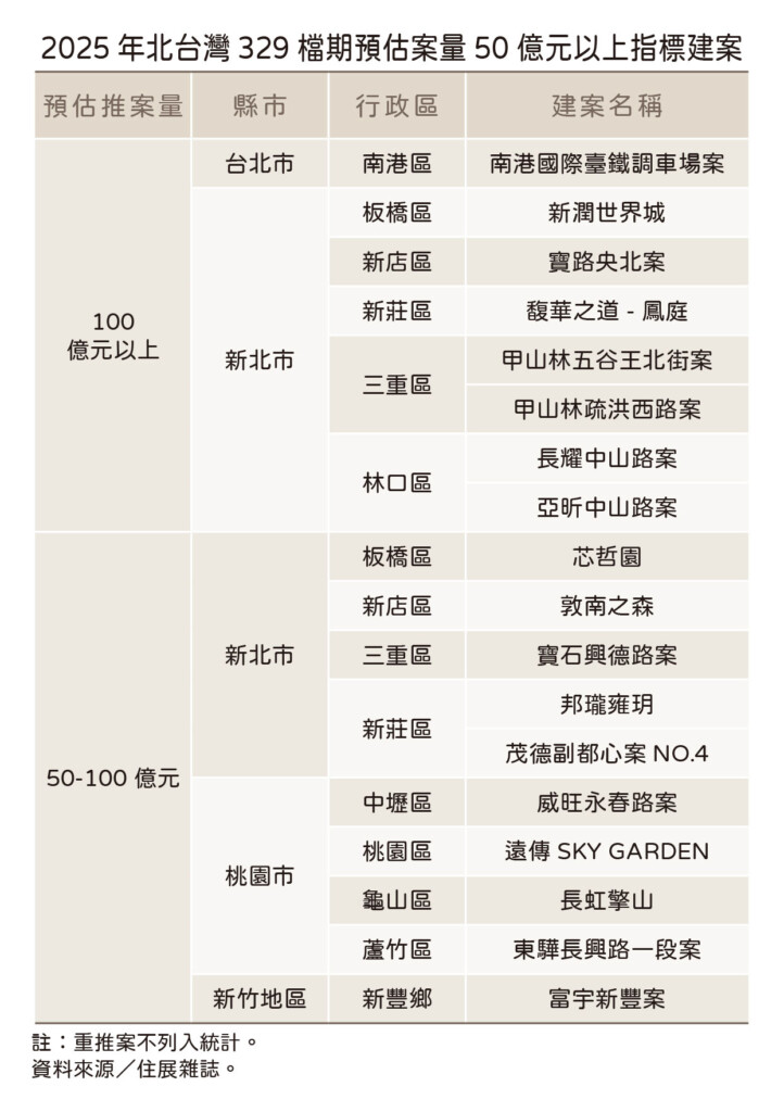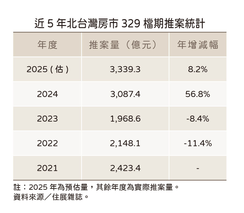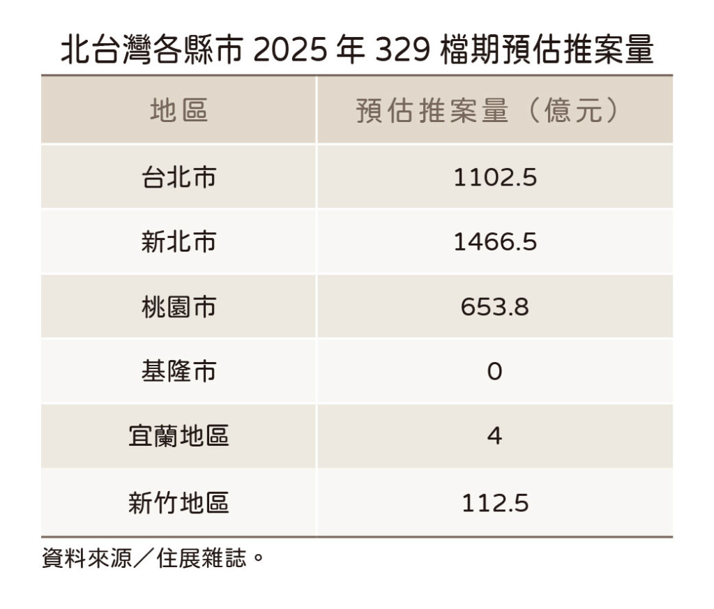 住展雜誌統計2025年北台灣房市329檔期推案預估量,來到約3339億元,再刷新紀錄,比去年同期熱況的實際推案量增加逾250億元,又與買氣上演逆走戲碼。