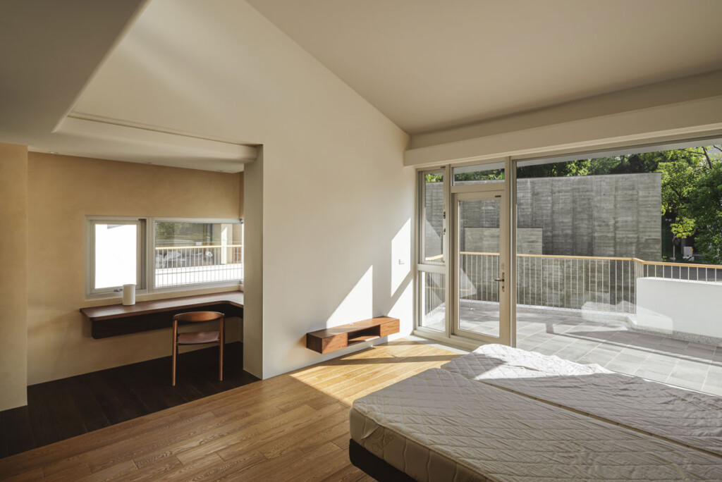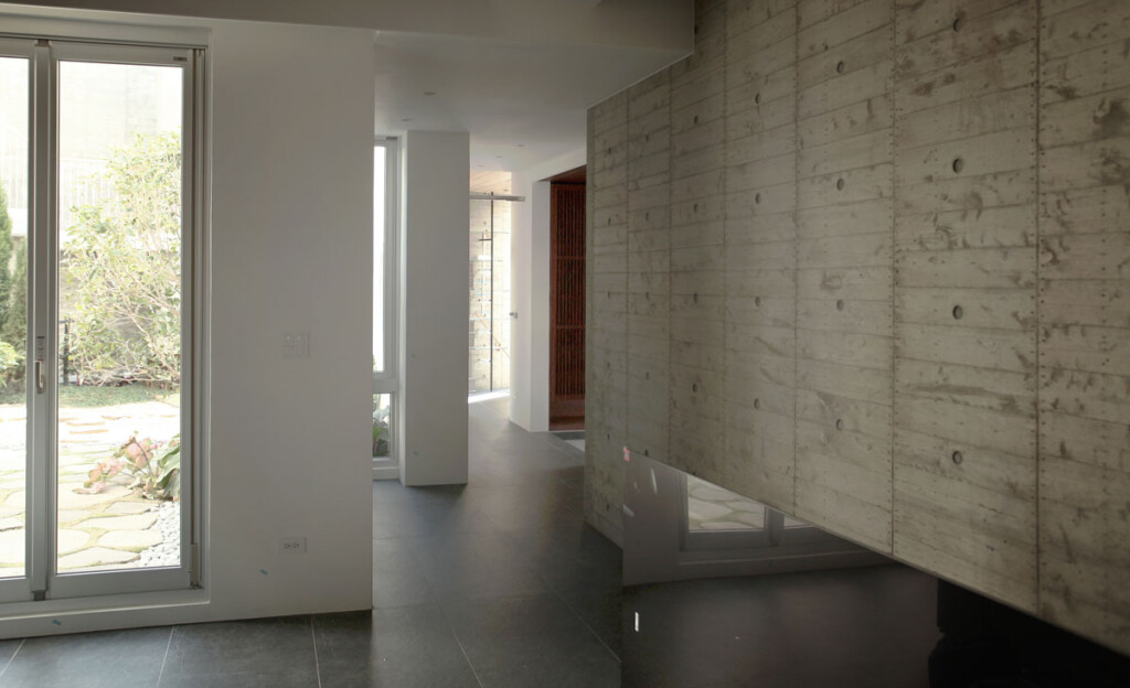 粗糙的模板木紋面清水大牆,高低錯落地環繞在建築物四周,與白色礦物塗料的外牆形成鮮明對比。有時作為圍牆,有時則成為室內牆的一部分,這些牆面在這樣的空間中扮演著園林山、石的角色,既作為材質反差的對比,也作為生活中的「遠景」,指引視線在內外之間延伸交錯。