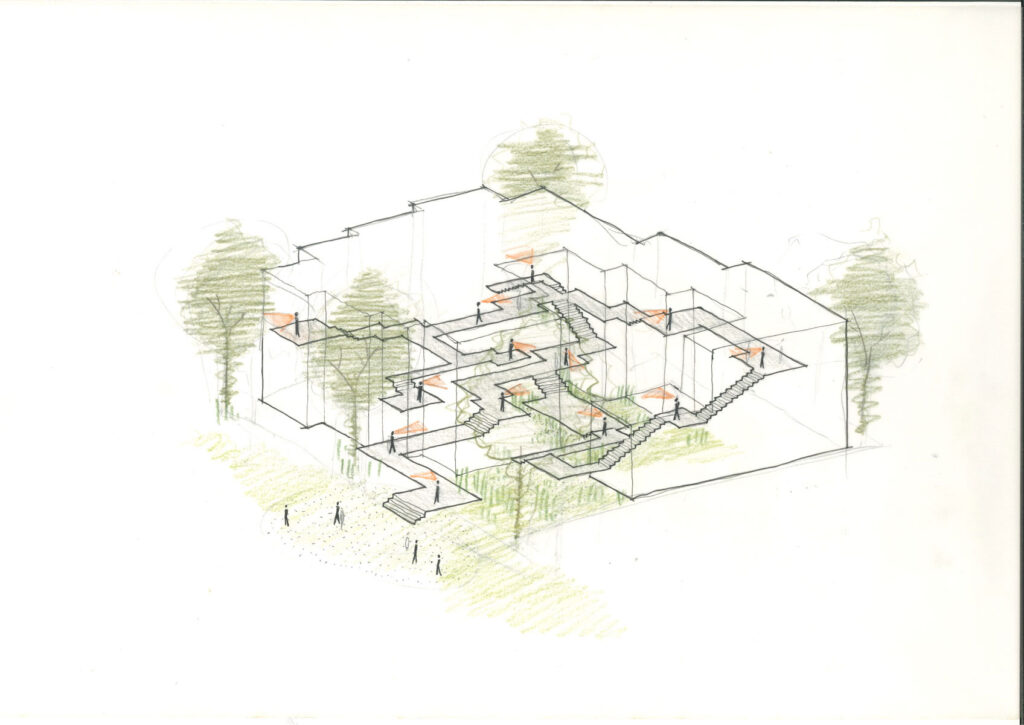 靠著環繞並貫穿其中的多變動線,林泓宇為一棟本質上靜止不動的建築物,創造了在其間不斷「迴、遊」的活動感。也因為回字型的錯落配置,讓整個建築單體在不同的視角中,呈現出簇群般碎化的樣貌,形成一種「部分自然、部分建築」的園林既視感。