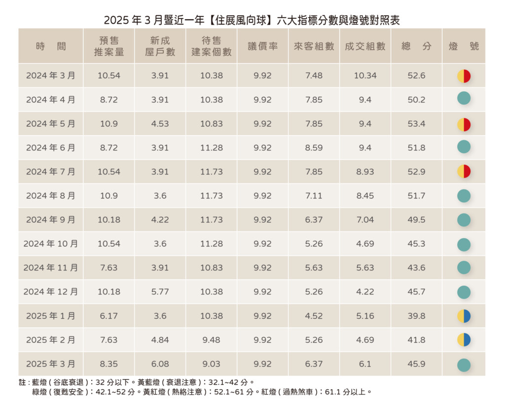時節入春轉暖,房市卻乍暖還涼,根據最新的住展風向球,燈號轉為代表穩定的綠燈,包括預售屋推案量、新成屋戶數、成交組數、來客組數指標走出衰退,乃在於當前進入傳統房市旺季,還有三二九檔期到來,建商布局新案,供給面如預售屋推案量、新成屋戶數見增,而需求面的追蹤指標建案每週平均來客組數、成交組數也回升,主因眼下以具備話題可望創造人氣的推案為主,如台北市文山區、新北市三重區、桃園市龜山區的新案都有不錯表現。