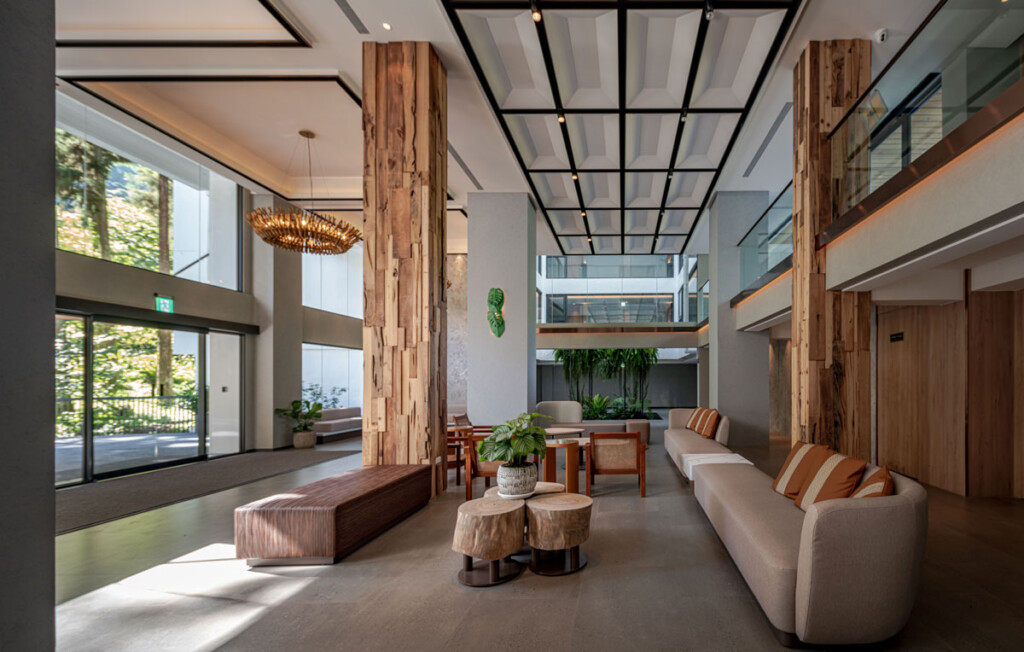 例如最引人矚目的室內採光與景觀改造。原本因應後勤空間不足而轉變為儲藏室使用的天井,在「功能還原」後成為一樓南北兩側的光影中心,藉光線的明亮將室內空間與周圍綠意交織,為旅客帶來一種置身於森林深處的靜謐感。每當光線自天井灑落,四周環繞的杉木將與室內的氛圍共鳴,為人們的心靈帶來片刻的寧靜與放鬆。