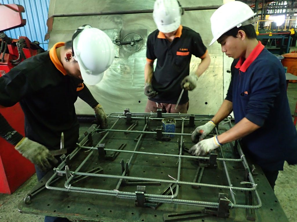 另一個則是鋼筋預組工法,執行方式是將在工地最耗人力及高技術的柱、梁鋼筋綁紮施工,轉換在鋼筋廠將整個柱、梁的每支鋼筋先預組綁紮完成,形成整體的柱、梁大型構件,再載運至工地,應用吊車或塔吊等吊運機具,於工地現場直接吊裝組立完成,充分利用機械能量替代勞力,減少人力需求同時,藉由鋼筋廠預組的有效品質管控,有效提升鋼筋工程施工品質,強化房屋的結構安全。
