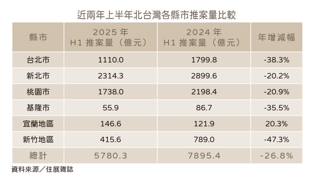 此外,上半年的推案量在在呈現建商對市場窘況的保守以對,建案能延就延,住展雜誌統計今年上半年北台灣新成屋、預售屋推案量,合計約5780.4億元,較去年同期減少2115億元,減幅近二成七。幅度最大的新竹地區,上半年計推出415.6億元,幾乎比去年同期少了一半量體,只有新竹市東區富宇建設新案超過30億元,回顧去年既有百億元大案,就有五案都在30億元以上,顯然兩樣情。