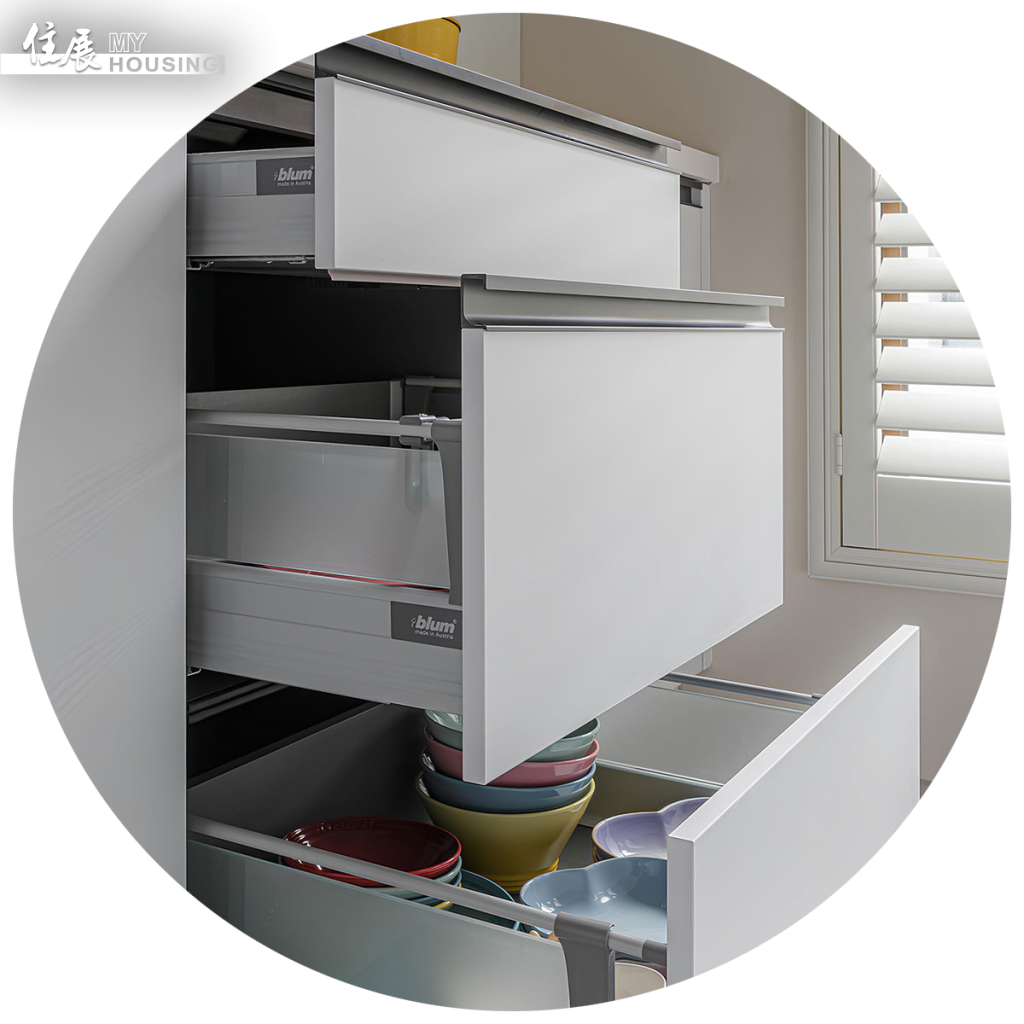 蘇政欣提醒,若要撐起開放式廚房的美感與機能,就得仰賴更高規格的五金與收納系統,例如緩衝滑軌、隱藏式把手與升降架等;否則「看得到、收不起來」的痛點,很容易出現。林京蔚則建議,可將陽台空間再利用,增設小水槽與暫放區,把潮濕物品移出主場域,守住視覺清爽。