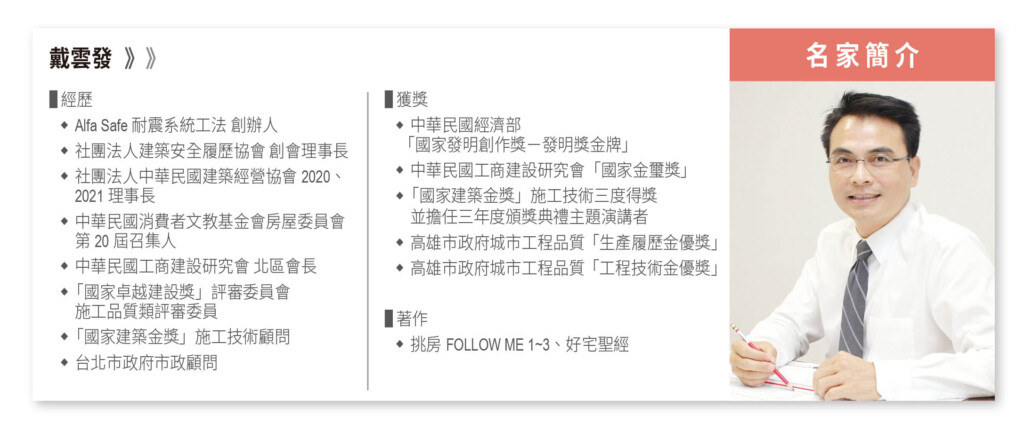 推動建築安全幾十餘年,最常見的問題是「圖面與現場不一致」,例如設計圖上標示的鋼筋規格、數量,在現場卻被縮減;擋土牆該做排水孔,卻因省成本而省略;土方回填該分層夯實,卻草草帶過等等。一棟房子,能不能耐得住時間與天災的考驗,往往決定於施工這一環。