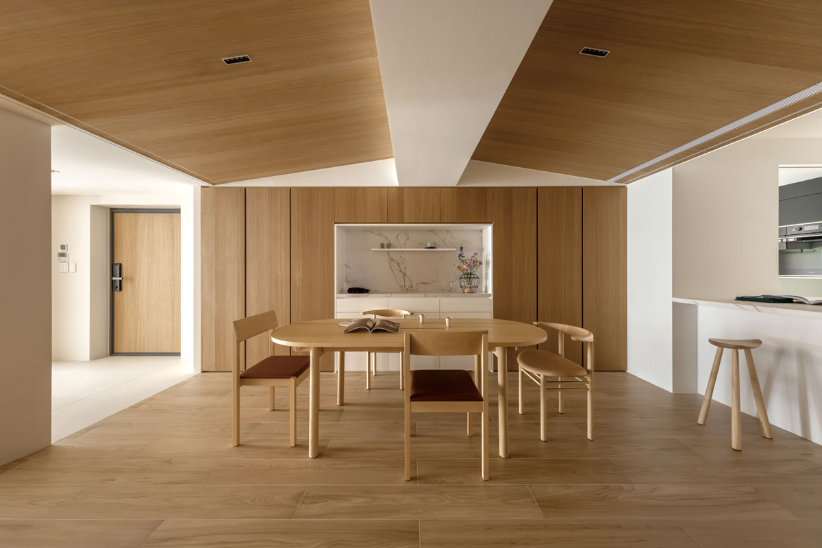 客廳與餐廳的連動,是空間的核心。黃鈴芳運用多年設計經驗累積出的「兩平面系統」來切割場域語言:客廳的天花板維持素雅平整,營造沉靜感;餐廳則因老屋結構保留裸露樑,她以斜屋頂裝飾設計,並透過立面與天花板的視覺比例修飾,帶出舒適性,同時打破老屋低矮樓高帶來的壓迫感,讓原本的限制轉化為另一種空間感。