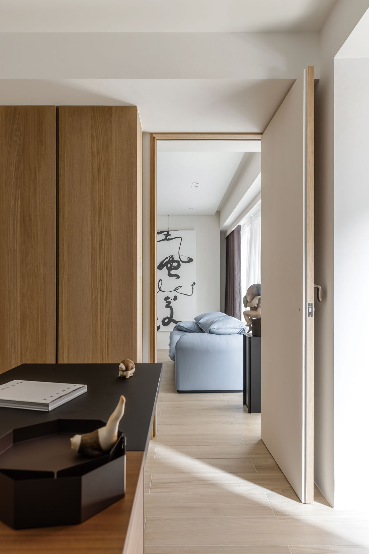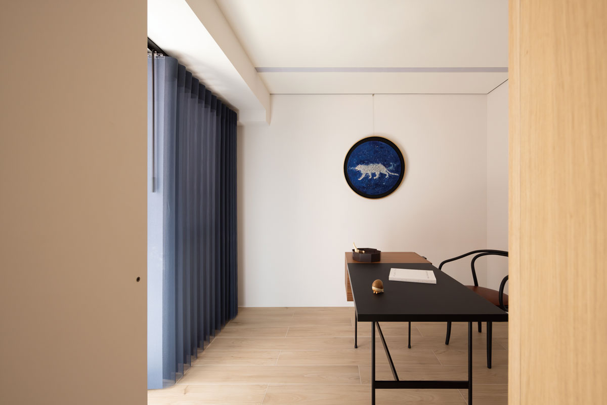 這份哲學,具體化在她近期的作品中。本案委託屋主是一對自美返台的夫妻,生活簡單,尤其外籍男主人是一位大學教授,酷愛東方哲學,書架上常見莊子與孟子的身影,也收藏書法與字畫。這樣的性格,使設計題旨十分清晰:空間不是炫耀舞台,而是一個能閱讀、對話、觀畫與靜坐的所在。