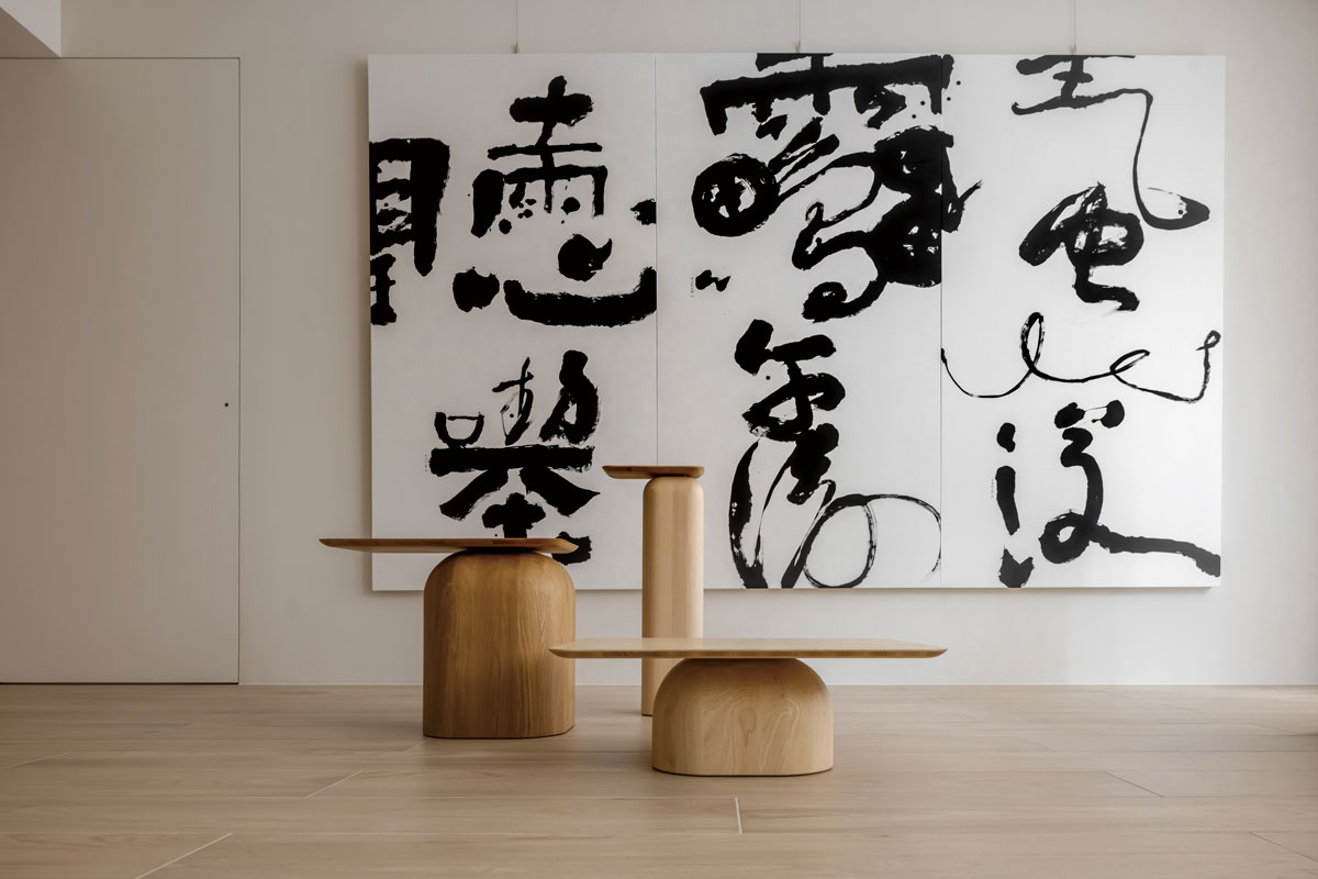 整體以木質為主軸,點綴石材與鐵件,並搭配藝術品。她引用莊子「樸素而天下莫能與之爭美」的精神,把材料控制在「清雅」的光譜內。木紋的溫潤、石材的低調,成為書法與字畫的背景,讓屋主的收藏自在呼吸。