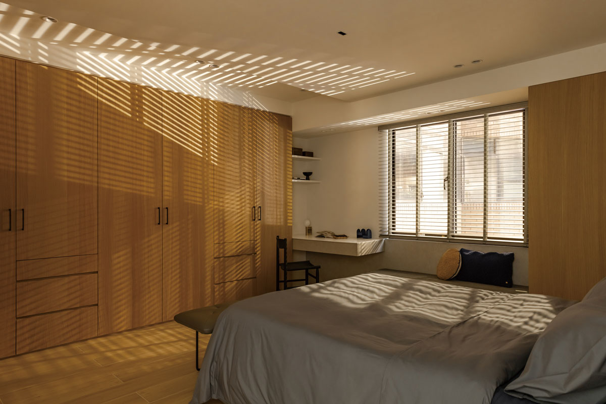 私領域中,主臥在窗邊設置臥榻,延伸連接書桌。夫妻倆睡前有聊天習慣,臥榻成了專屬角落,讓「說話」這件小事被空間看見。客房則透過天花板的弧度化解樑下壓迫,視覺被放大,結構從問題變成線條。