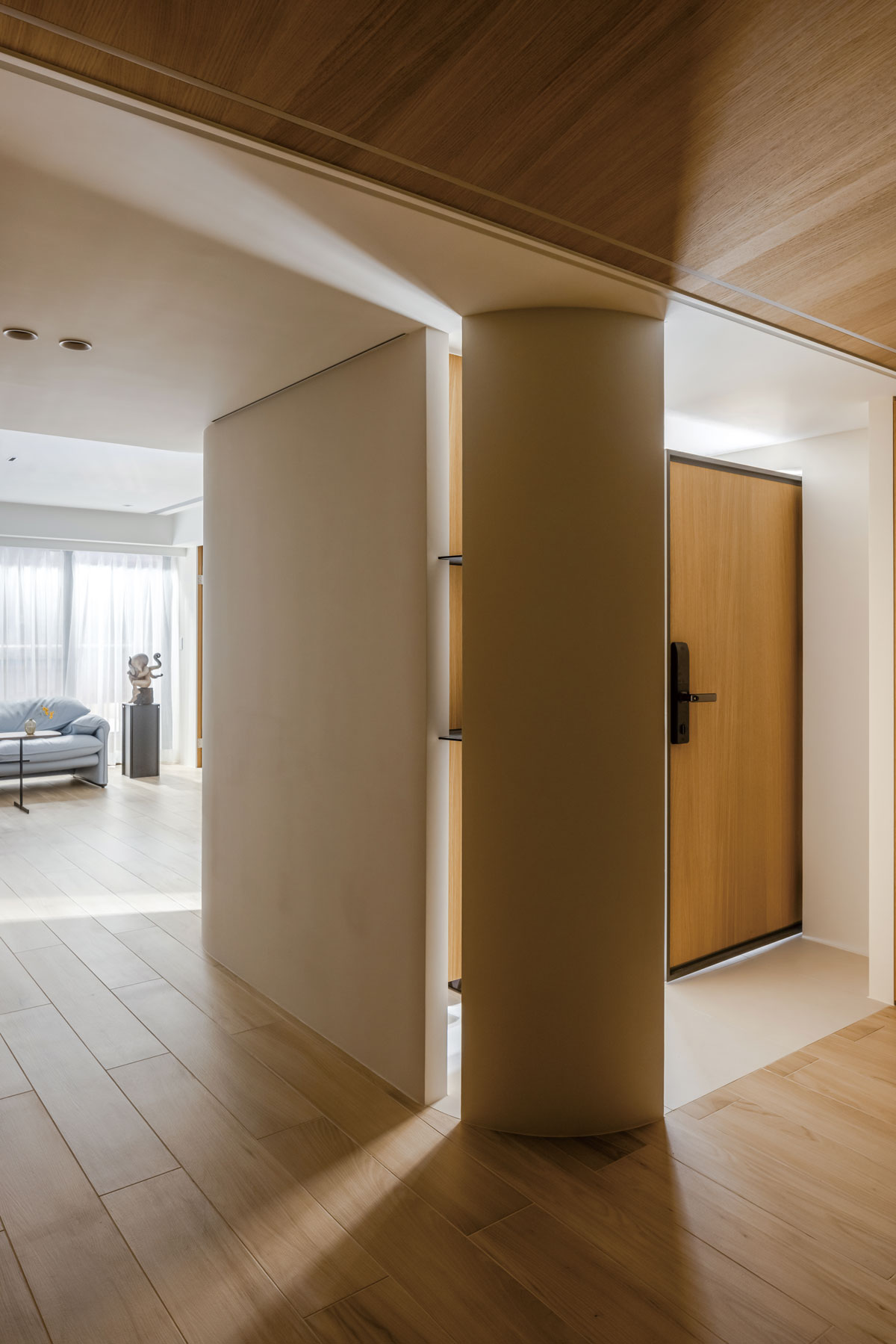 她以弧形玄關重塑入口,遮斷入門見廁的尷尬,同時安放端景與傘架,讓生活細節自然被照顧。弧度延展了光的流動,第一眼進門不再是阻斷,而是視線的遠方。這是一個很小的手法,卻改變了家的第一印象。