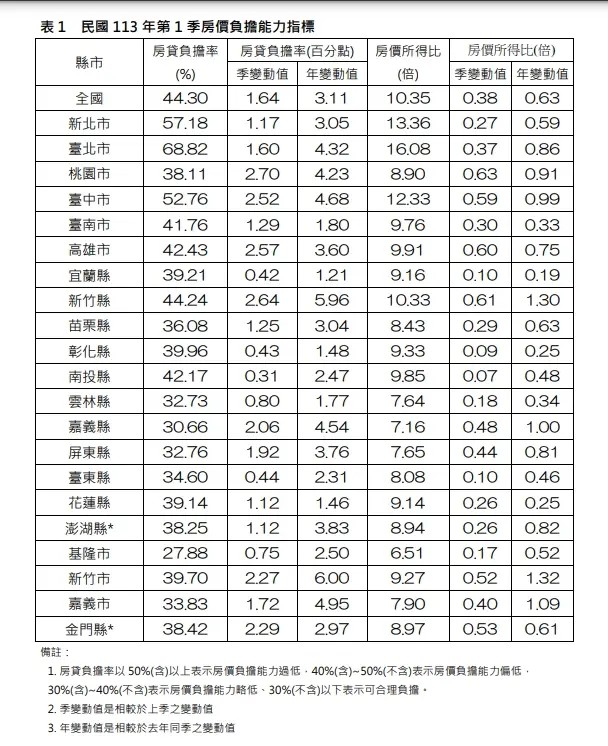 其他縣市的房貸負擔率,首季南投縣及新竹縣為房價負擔能力「偏低等級」,宜蘭縣、苗栗縣、彰化縣、雲林縣、嘉義縣、屏東縣、台東縣、花蓮縣、澎湖縣、新竹市、嘉義市、金門縣等12縣市,介於30%至40%間,房價負擔能力為「略低等級」。值得一提的是,全台只剩下基隆市是比較可負擔的,該市房貸負擔率均低於30%,房價負擔能力為「可合理負擔等級」。