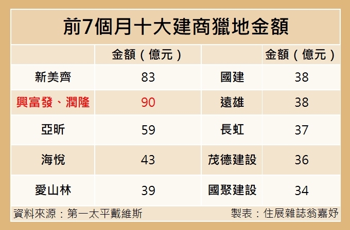 前7個月購置土地及商用不動產的前十大建商,第一名有獵地王之稱的興富發集團,包括旗下的潤隆建設,合計交易總額達90億元,主要購地包含台中七期惠順段共37.9億元、22.7億元買台中七期惠安段,以及23.4億元買高雄苓雅區等。
