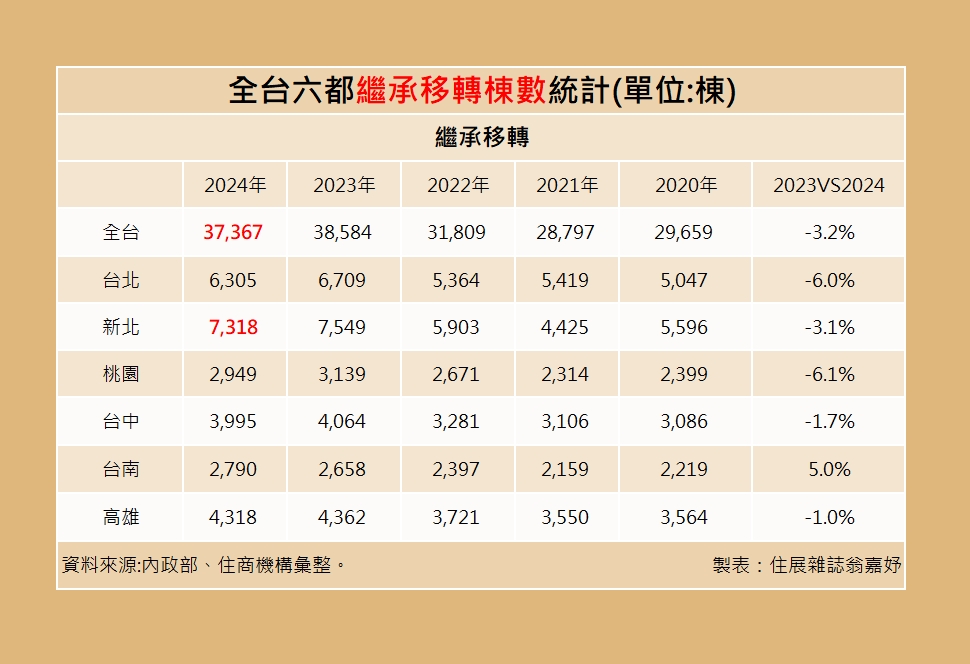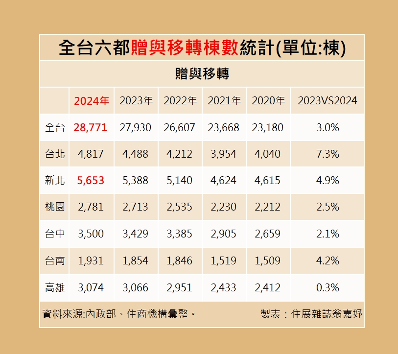 此外,細究六都贈與移轉棟數數據,上半年以新北市5,653棟最多、台北市4,817棟名列亞軍;其中,北市贈與移轉棟數與去年同期相比,漲幅達7.3%,更是冠居六都,大家房屋企劃研究室公關主任賴志昶表示,雙北為全台房價最高的都會區,尤其北市更集中不少金字塔族群,若持有多戶不動產,房屋稅等持有成本自然較高。