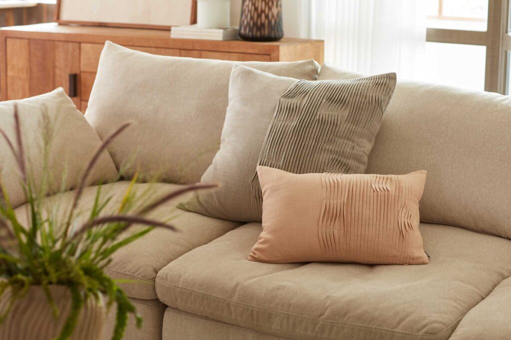 在家紡配飾方面,以台灣自然地景為靈感的抱枕,PALETTE素色系列從風土中提取濃淡,將溪頭⽵林的綠、⾦⾨瓷⼟的⽩、花東稻穗的黃等化融入居家用品,牽引出對自然的想像;查莉壓線百褶抱枕,則是以充滿動態韻律的百褶工藝,捕捉浪花拍打沙灘時跌宕的層次感,將自然的氣息帶至居所。
