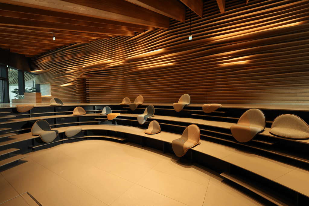 演講廳裡的桌椅設計概念來自達利名畫《記憶的堅持》,畫作上融化的鐘錶、爬行螞蟻、桌子等,都是催生公共家具豐富線條的基礎。設計師莊騏鴻認為美術館室內下沉空間未來將是創意交流的第一現場,而建築曲面設計正與《記憶的堅持》有著強烈呼應感,一階階下沉樓梯和融化坐椅造型,富含衝突卻巧妙的平衡。