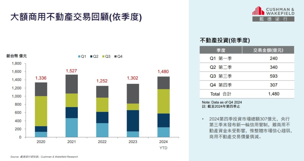 戴德梁行認為,台灣商用不動產市場受到產業需求與市場資金豐沛的雙引擎推動,2025年有望延續熱度,成為投資者與產業用戶不可忽視的重要領域。