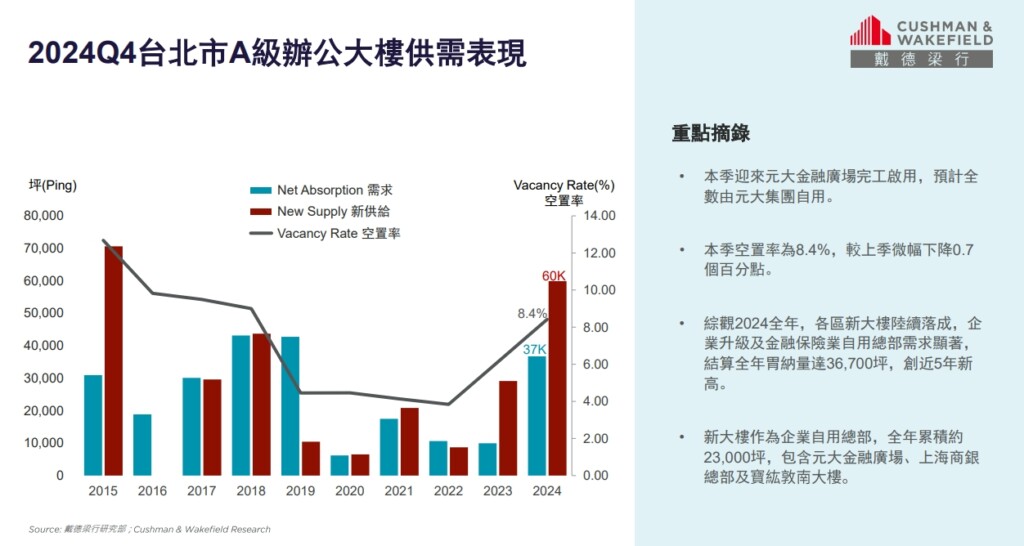 展望2025年,隨著更多舊市區新大樓落成,市場將進一步滿足企業升級需求,同時帶動租賃市場成長。戴德梁行預期,ESG標準與高效空間解決方案將成為未來競爭焦點,持續推動台北市A級辦公大樓市場向高品質、多元化方向發展。