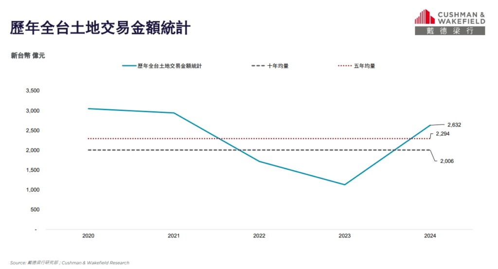 根據戴德梁行統計,2024全年土地交易量為新台幣2632億元,相較2023年僅1129億的谷底交量足足超越了1.3倍,不僅是2022年央行升息以來之年度新高,亦為史上第四高,僅次於央行升息前於2019-2021年創下年均量突破3000億的黃金3年,也輕易越過了2,294億的5年均線。