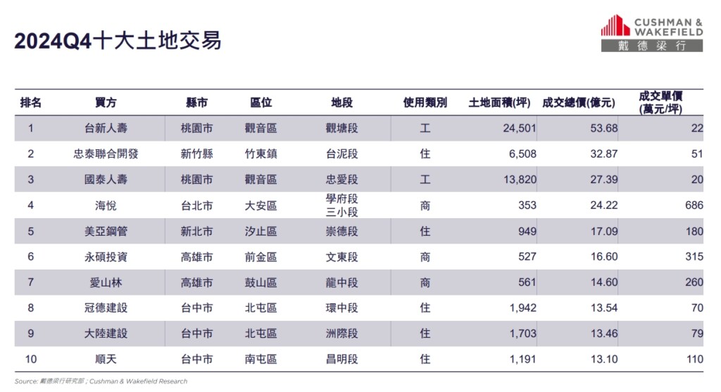 戴德梁行表示,2024年住商類土地交易突破性成長主要發生在第三季,包括台灣人壽及達麗/海悅/彥文合資、新美齊、興富發、亞昕、遠雄等5家建商的鉅額土地交易一舉將單季交易量衝破千億大關,結算至年底也順利站上2024年度十大土地交易之六席。其中2宗屬於產業用地,分別由壽險背景的台灣人壽及台新人壽取得,另外8宗屬於住商類土地,皆由建商取得。
