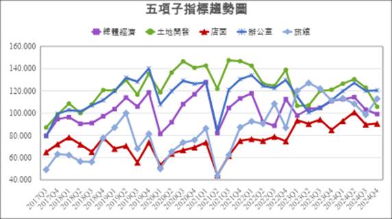根據調查,2項指標(辦公室、店面)較第3季上升;2項指標(總體經濟、土地開發)較第3季下降;辦公室、土地開發為偏向樂觀的信心水準,店面及總體經濟為偏向保守。