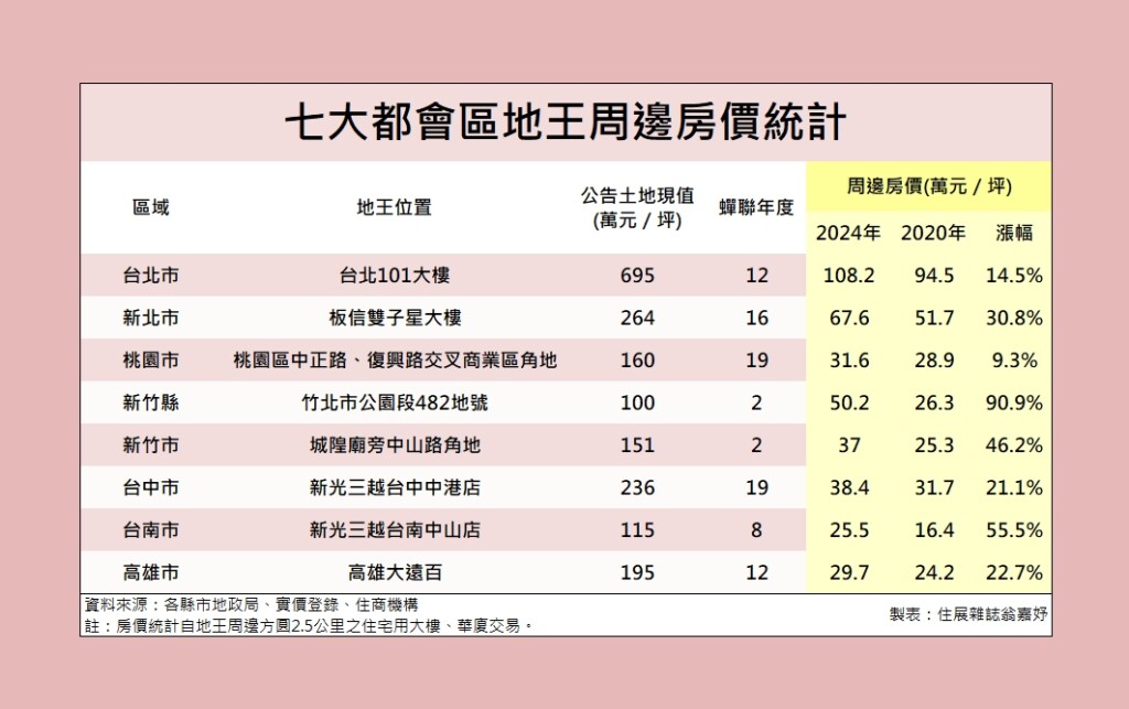 觀察七大都會區地王周邊房價,發現台北市地王101大樓不僅公告土地現值高達每坪695萬元,周邊住宅平均成交行情也高達每坪108萬元,雙雙位居七都之首。