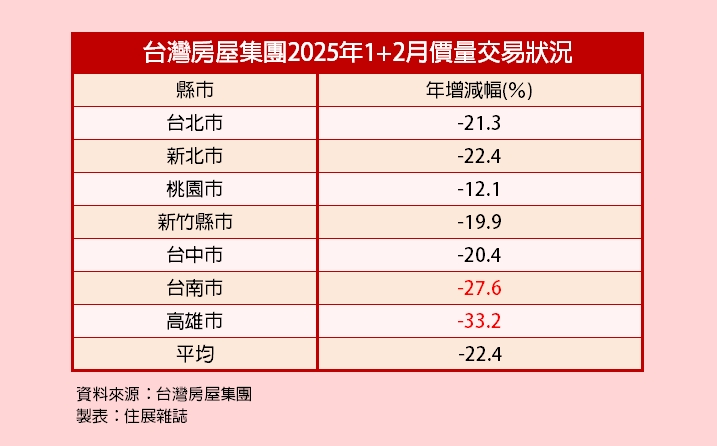 台灣房屋集團統計內部成交行情,今(2025)年2月價量表現整體呈現回升,較1月有所改善。若將1月和2月的數據加總來看,六都以及新竹縣市的表現相較去年同期的房市熱潮,則顯示整體年減22.4%;其中以高雄的降幅最大,達33.2%;其次為台南,降幅為27.6%。
