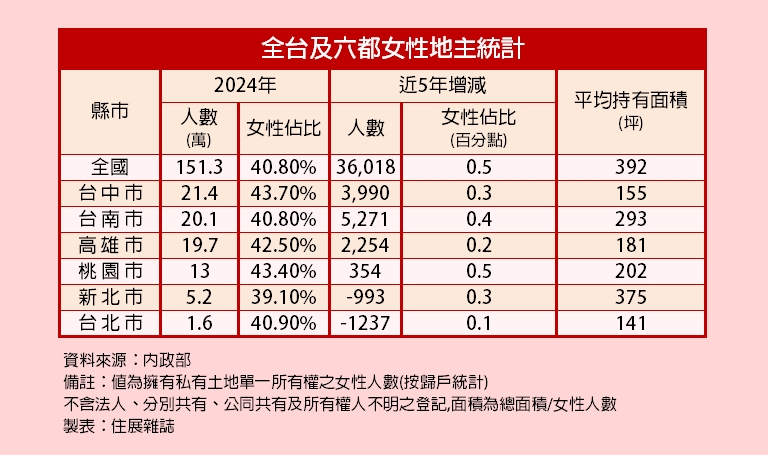 根據統計,全台女性地主的平均土地面積約為392坪,較5年前增加約3.6坪。六都中以新北市女地主擁有的土地面積最大,平均每人約擁有375坪;其次是台南市293坪;台北市女地主則擁有最小的土地,平均僅約141坪。